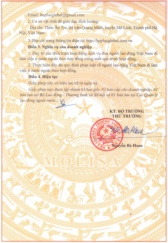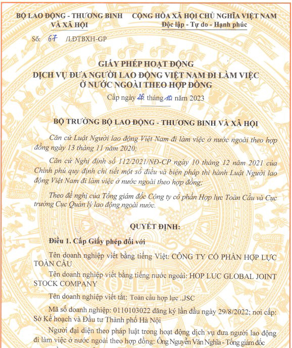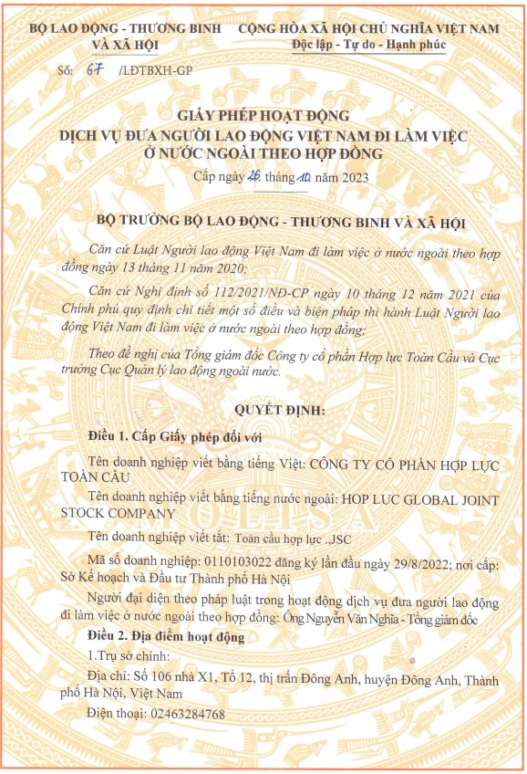 Công ty cổ phần Hợp Lực Toàn Cầu là một trong những đơn vị tuyển dụng nhân lực chuyên nghiệp và đáng tin cậy nhất Việt Nam. Hiện tại công ty có trụ sở tại Hà Nội – thủ đô của Việt Nam và được Bộ Lao động, Thương binh và Xã hội Việt Nam cấp giấy phép đưa nhân lực Việt Nam đi làm việc ở nước ngoài.