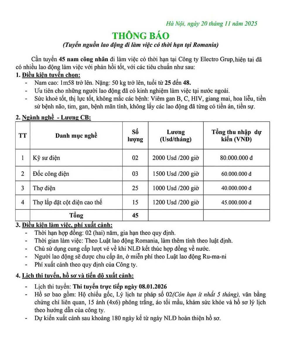 Tuyển Thợ Điện Đi Rumani 2026 – XKLD Rumani Lương Cao, Điều Kiện Minh Bạch