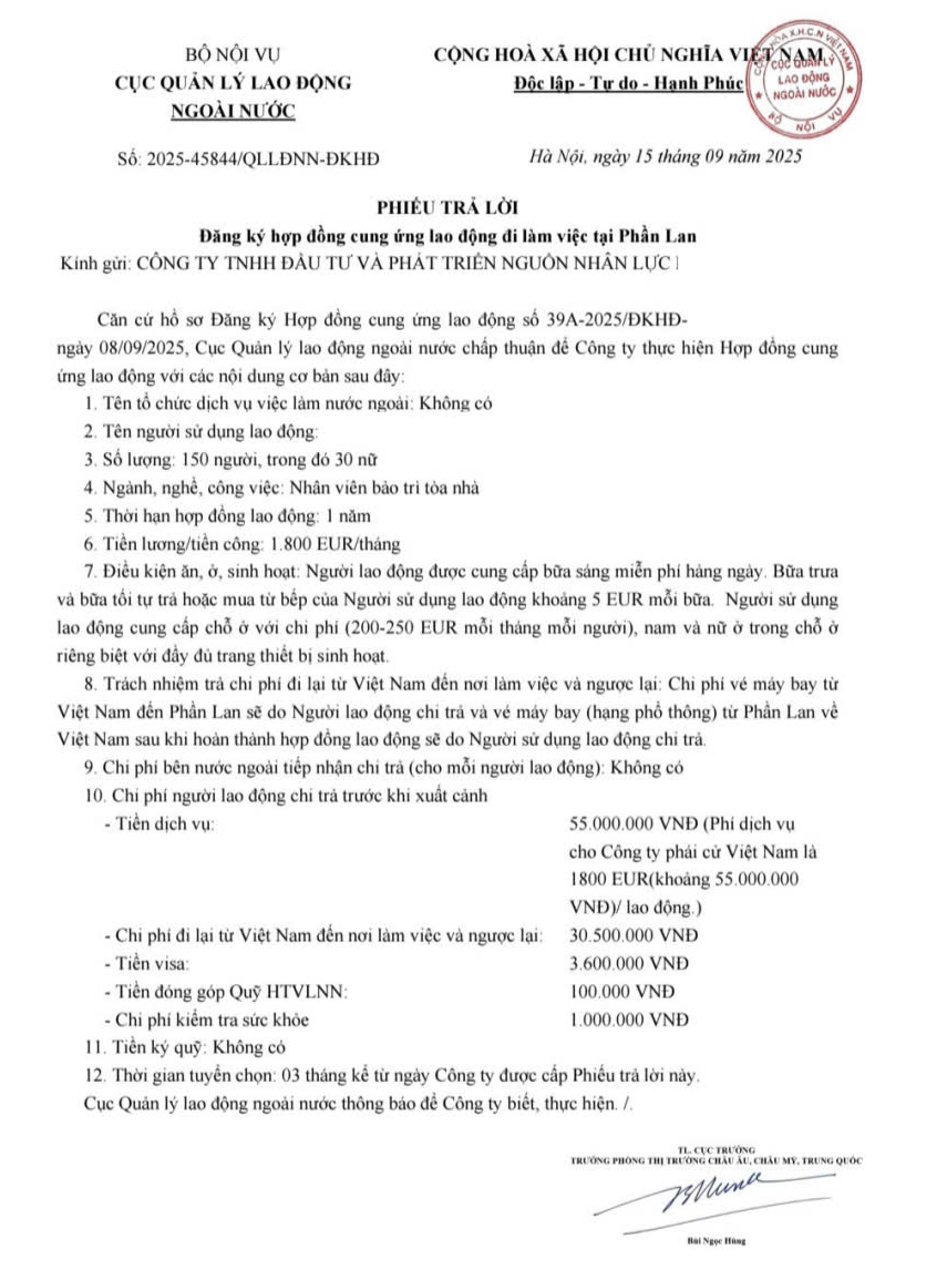 Lưu ý: Phần Lan thuộc EU nên tuyển lao động theo dạng có giấy phép làm việc và cư trú (residence permit for work) chứ không giống các thị trường XKLĐ phổ thông như Nhật/BH/Đài Loan. Và việc tuyển người lao động Việt Nam sang làm việc ở Phần Lan chính thống rất ít nên giá có thể khác biệt tùy từng đơn vị giới thiệu.