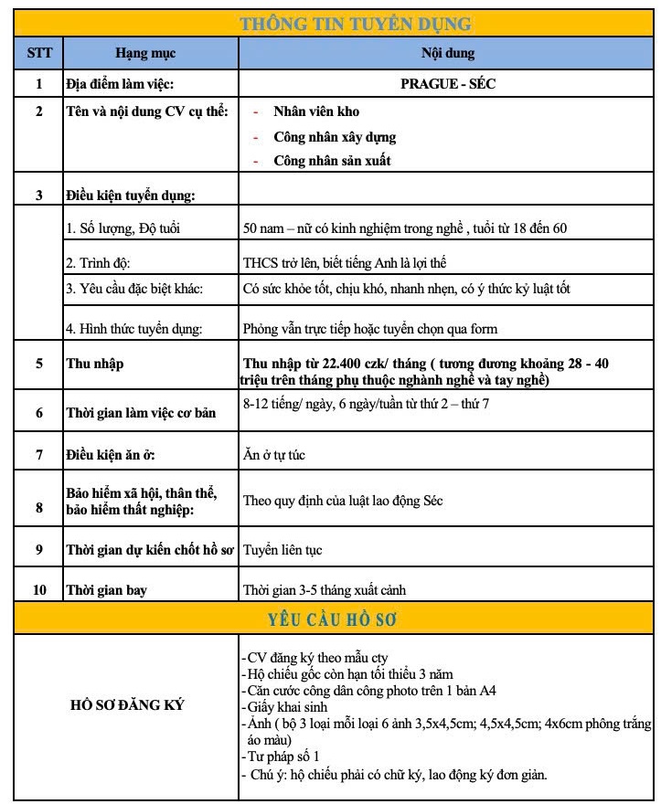 Tham khảo đơn hàng đi XKLĐ Séc